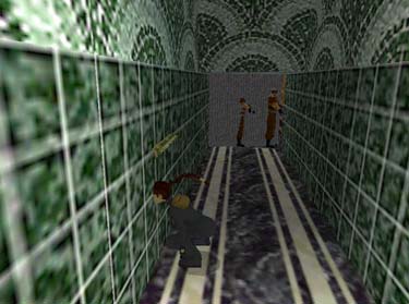 Not only do those guys in the background look uncomfortably intimate with that door, Lara's getting painfully friendly with the tiles... This screenshot is from 'Recon Labs', by Emoo.