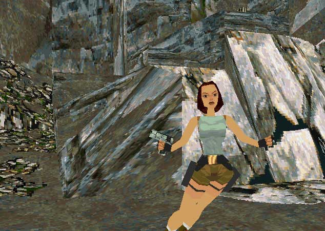 Serenely, serenely...float (never mind where your second gun has gone either...). In the words of the person who took it - "Well actually it looks like she tripped (probably over larson's revolver)." Pic taken by Derek Oswald of The Tomb Raider Information Highway in the TRueView, TR level viewer (works on all games), which you can get at this site.