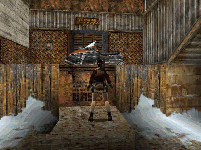Silly places for a snowmobile (just back it slowly off the ledge to Lara's right)...but what's the point, you ask ? All you can do is get it stuck in some silly little room ! Well, if you park it just to the left of the door, when you've gone into the next room, once you've pulled the switch turn around immediately and run back to the first room with the snowmobile. The guy with the gun will be in there, standing right in the snowmobile. Run to it, and get on...and you'll get something spectacular like this below :) (look, it's half man, half snowmobile !)